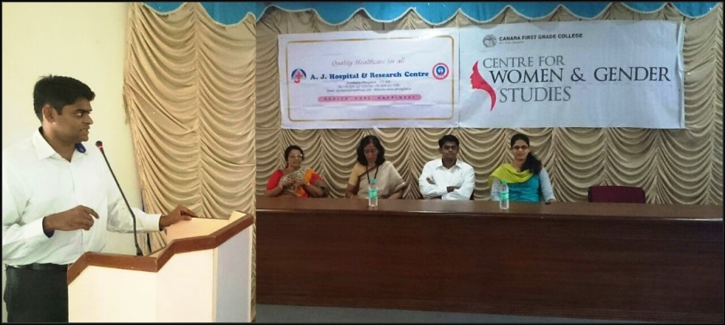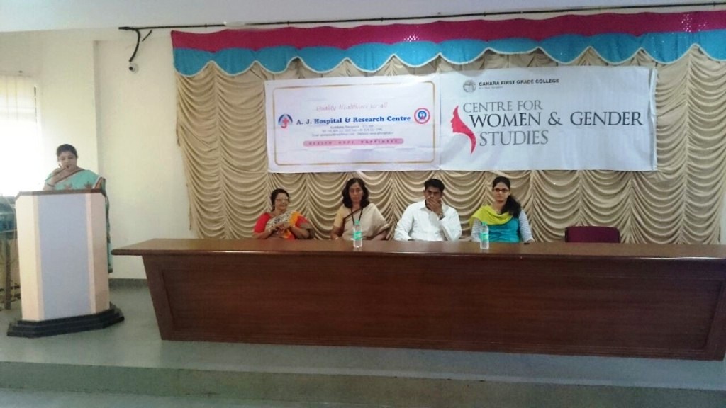 Centre for Women and Gender Studies of the college has organised an awareness programme on Cancer in collaboration with A.J.Hospital and Research Centre, Mangaluru on 23rd July, 2015 for the girl students and faculty members. Dr. Rachan Shetty and Dr. Kavitha Shetty were the resource persons. Dr. Rachan Shetty explained the causes for the cancer and the precautions to be taken. Dr.Kavitha Shetty created awareness on Breast Cancer & Cervical Cancer, its causes & preventive measures. Displaying slides and videos, she rolled out statistics to prove the alarming increase in breast cancer cases in recent years. Demonstrative videos to explain how to carry out Self Breast Examination (SBE) were shown and advised the girl students & faculty members on the measures to be taken to protect themselves from the dreadful disease. The programme was well received by all and was very useful. 150 students benefitted from this programme.Dr.K.V.Malini, Principal of the college presided over the function. Prof. Seema Prabhu S., Director, Centre for Women & Gender Studies welcomed the gathering. Prof. Sushma R. Shetty rendered vote of thanks.