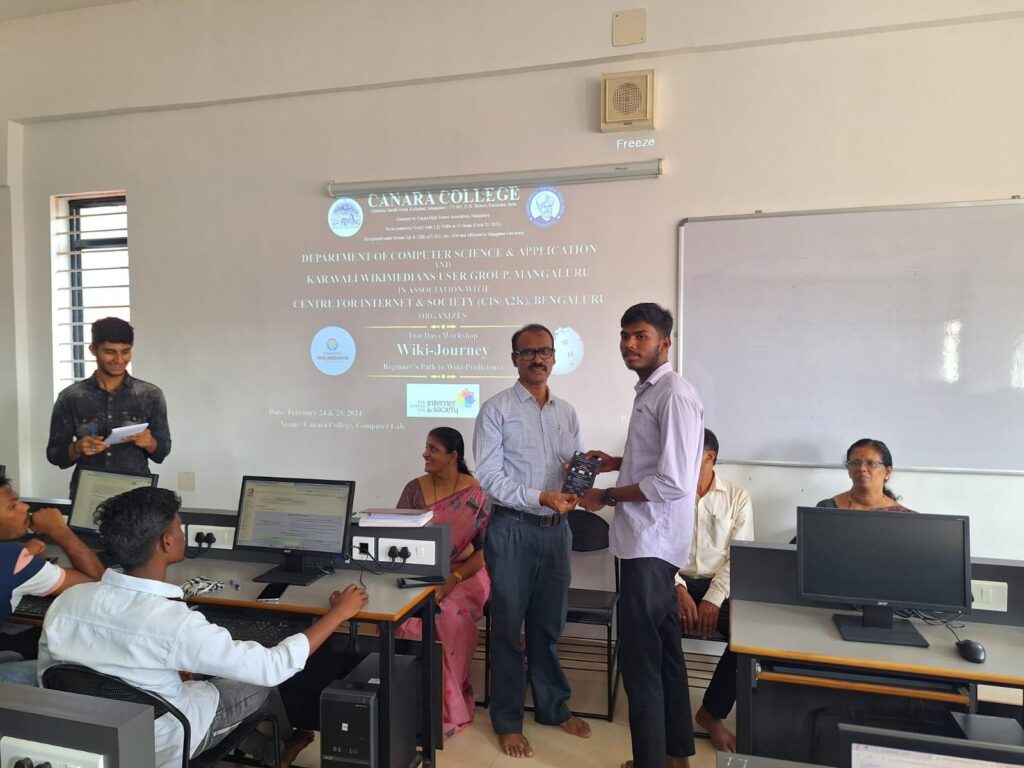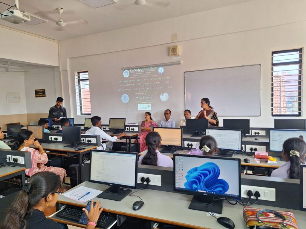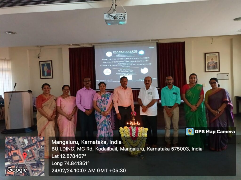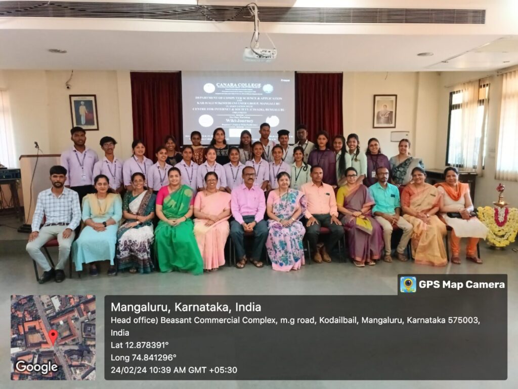 A two-day Wikipedia Workshop- ‘Wiki-Journey– Beginner’s Path to Wiki-proficiency’ in association with Karavali Wikimedian User Group and CIS/A2K, Bengaluru was conducted by the Department of Computer Science and Applications at Canara College on February 24 and 25, 2024 at Computer Laboratory. The workshop aimed to familiarize students with the significance and functions of Wikipedia, especially of Karavali Wikipedia; and how active participation can contribute to both personal and academic growth.