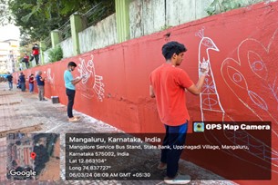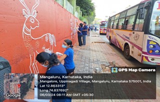 During the outreach programme, members of the Can-Cabinet Student Welfare Council and volunteers of Swacch Mangaluru Abhiyan undertook the task of cleaning the bus stand and painting compound walls that had been defaced by public urination, creating a foul environment. The wall beside the road leading to the Service Bus Stand, State Bank, Mangaluru, which previously emitted a strong stench, was transformed into a canvas for wall art. The footpath and wall, once an eyesore, were thoroughly cleaned using pump water.