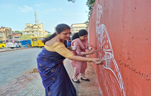 Members of the Can-Cabinet Student Welfare Council, artists from Aditattva Arts, and volunteers of Swacch Mangaluru Abhiyan from Mangaluru Ramakrishna Mission collaborated to beautify the wall, turning it into an open gallery adorned with Warli Art. The entire 3500 sqft wall was first painted white, followed by a second coat of Terracotta (red paint).