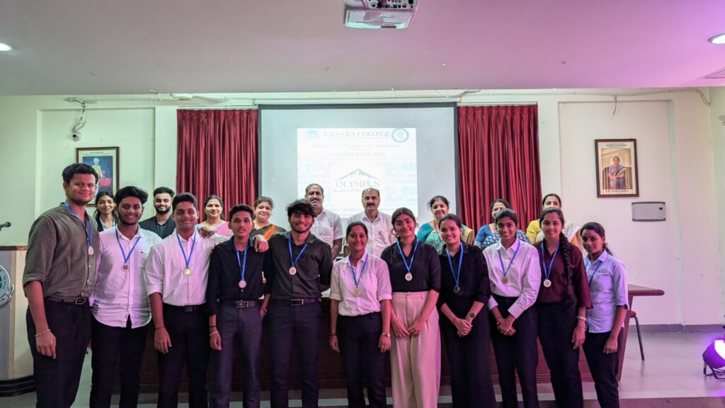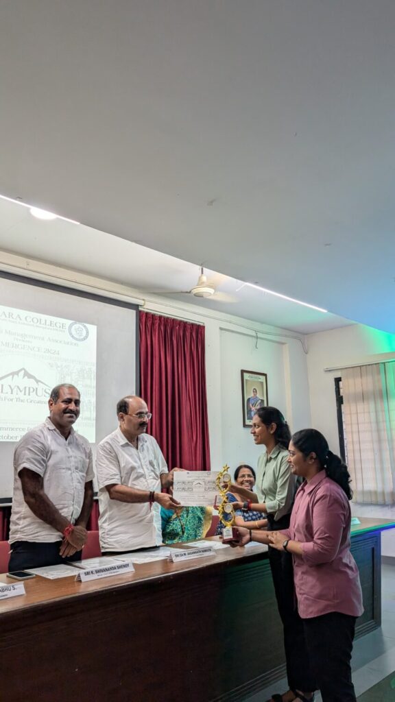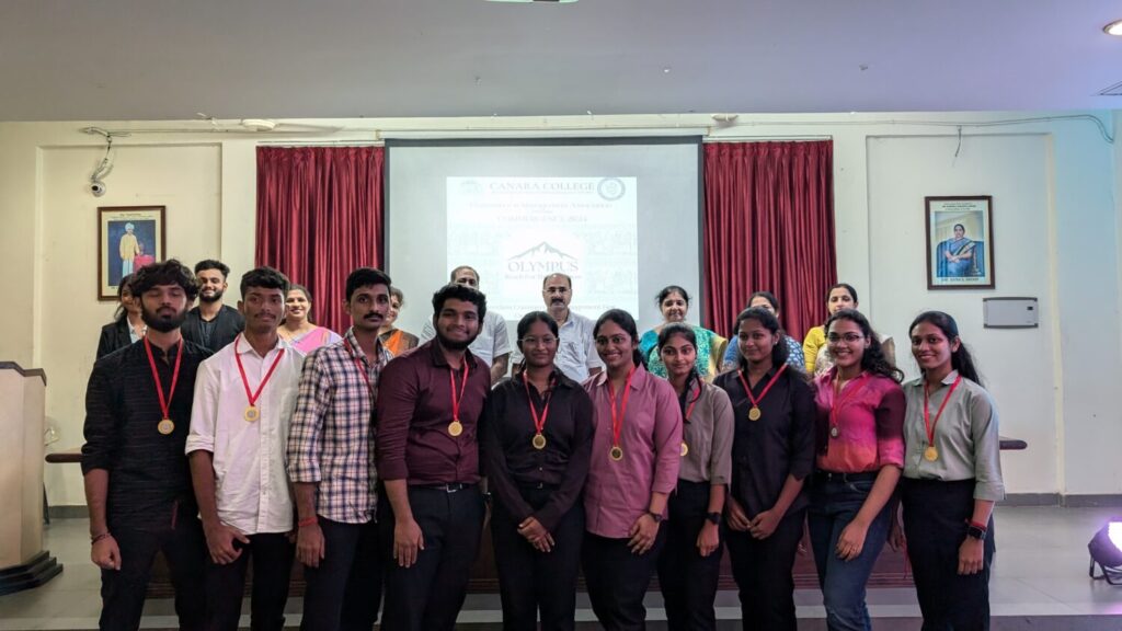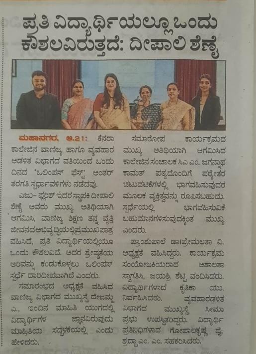 Ms. Arpitha Salian of III B.Com B compered the programme, Staff Convener, Mrs. Ashaltha welcomed the gathering, Mr. Gopalkrishna Pai briefed about OLYMPUS. Staff Convener, Mrs. Jayashree Shetty proposed the vote of thanks.  The Fest witnessed 14 registrations from 97 students of all the streams. The events included Best Manager, Finance, Marketing, Human Resources, Public Relations, Photography & Videography and Business Quiz. All these events, combined with education and fun, explored the professional and personal excellence of our students. All these events functioned smoothly and were adjudged by our own esteemed faculty members, professionals and by our own alumnus. The Valedictory programme of the OLYMPUS was held at 5.00 PM.  The chief guest Sri CA M. Jagannath Kamath, Correspondent of the college said that it is important for a student to engage in extracurricular activities in addition to their academic studies. The Head of the Department of Business Administration stated that there are only two options in the competition, trying and winning. She also encouraged the youngsters to take the results of the fest in a sportive manner. The Principal Dr. Premalalatha V., in her presidential remark, mentioned that participation is more important than winning, students will be deputed to different inter-collegiate fests and so this type of fests within the college would be more helpful to them. She concluded her words by advising the students to uphold the reputation of the institution. The participants shared their feedback about the fest. Student Conveners Mr. Gopalkrishna Pai and Ms. Shradda M. M. announced the winners of various events and they were honored with Trophies and Certificates. A total of 161 students benefitted from this fest. All the participants received their participation Certificates.