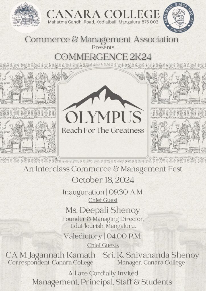 An inter-class Commerce and Management Fest OLYMPUS was organized by the Commerce and Management Association for the first-year students of all the streams on October 18, 2024. The inauguration of the same was held at 9.30 AM by the Chief Guest Mrs. Deepali Shenoy, Founder and Managing Director, Edu-Flourish, Mangaluru. Mrs. Deepali Shenoy began her address by recalling the opportunity she had during her college days. She stated that Commerce and Management Association played a very important role in her life. She congratulated the staff and students on their choice of theme and tagline. She asserted that greatness exists within everyone, it is up to the individual to recognize the greatness within himself. She also stated that an individual’s degree life is a turning point for everyone and advised the students to use the talents within them and make it memorable.