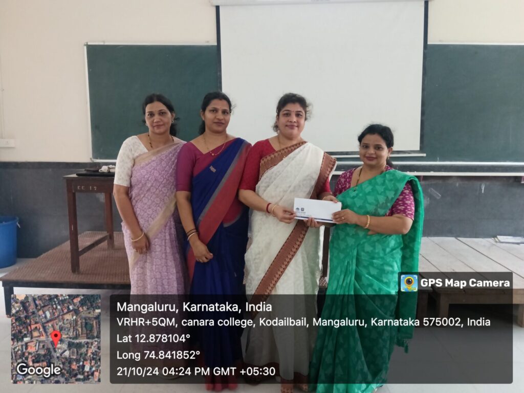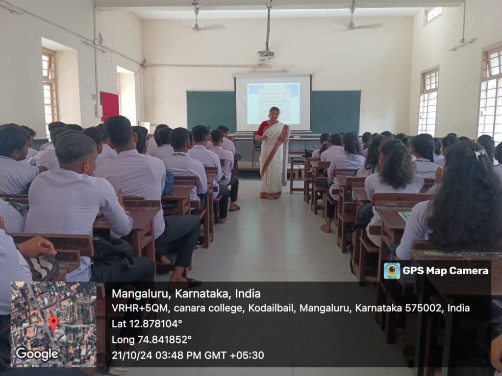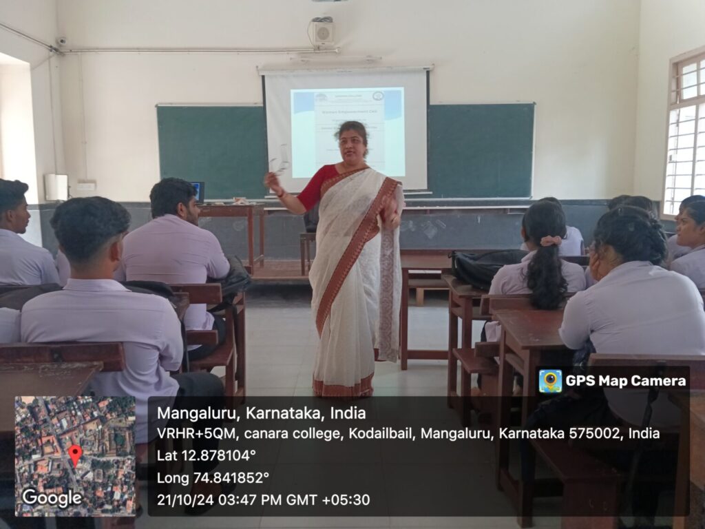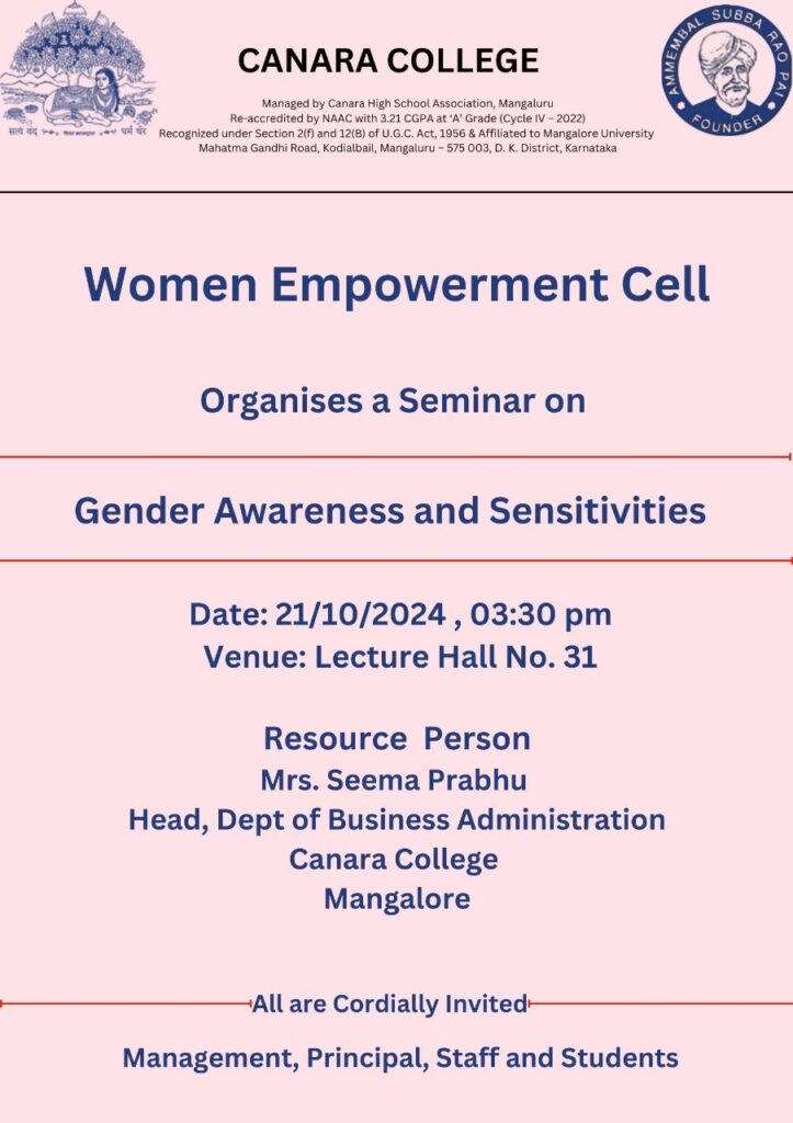 A seminar on “Gender Awareness and sensitivities “was organized by Women Empowerment Cell  of Canara College, Mangalore on October 21, 2024 .The resource person was Mrs. Seema Prabhu, Head, Department of Business Administration, Canara College . This session focused on defining gender sensitivity, the social constructs of gender, and how they manifest in daily life. The resource person elaborated on how gender sensitivity can be integrated into educational systems and curricula. All the queries of the students were answered through interactive session. The session was well received by the students.  111 students were benefitted from this programme. The session was coordinated by Mrs.Vinoda V Nayak and Mrs.Adithi Nayak, the conveners of the Cell.