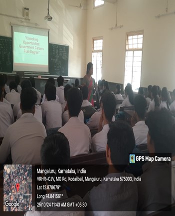 The session on Preparations for Competitive Exams was held on October 23, 2024, in lecture hall 1 at 11:30 am. Mrs. Megha Rao, lecturer, Centre for P.G Studies in Commerce, Canara College, was the resource person of this session. She briefed the students about different job exams upcoming for 2025 and how they need to prepare themselves to crack those exams. She gave them details about such exams and a list of government websites. She also suggested some free sites for mock practice. It was a very informative session for the students to prepare themselves for their upcoming careers. 50 students actively participated in this session. Mrs. Jayashree Shetty, Faculty, Dept. of Commerce and Management and convener of the Cell, coordinated the activity.