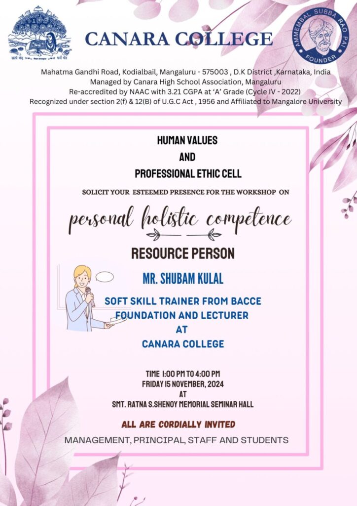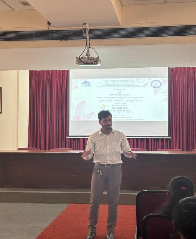 On November 15, 2024 the Human Values and Ethic Cell conducted a workshop on “Personal Holistic Competency” for the students. Mr.Shubham Kulal, Trainer from BACCE  Foundation, Bangalore and Lecturer at Canara College was the key speaker of the session. Miss Manaswi of III B.Sc welcomed the Speaker and Dr.Asha Kiran Pakkala, Convenor of the cell put forward the importance of the workshop to the audience. Dr.Premalatha, Principal presided over the function.