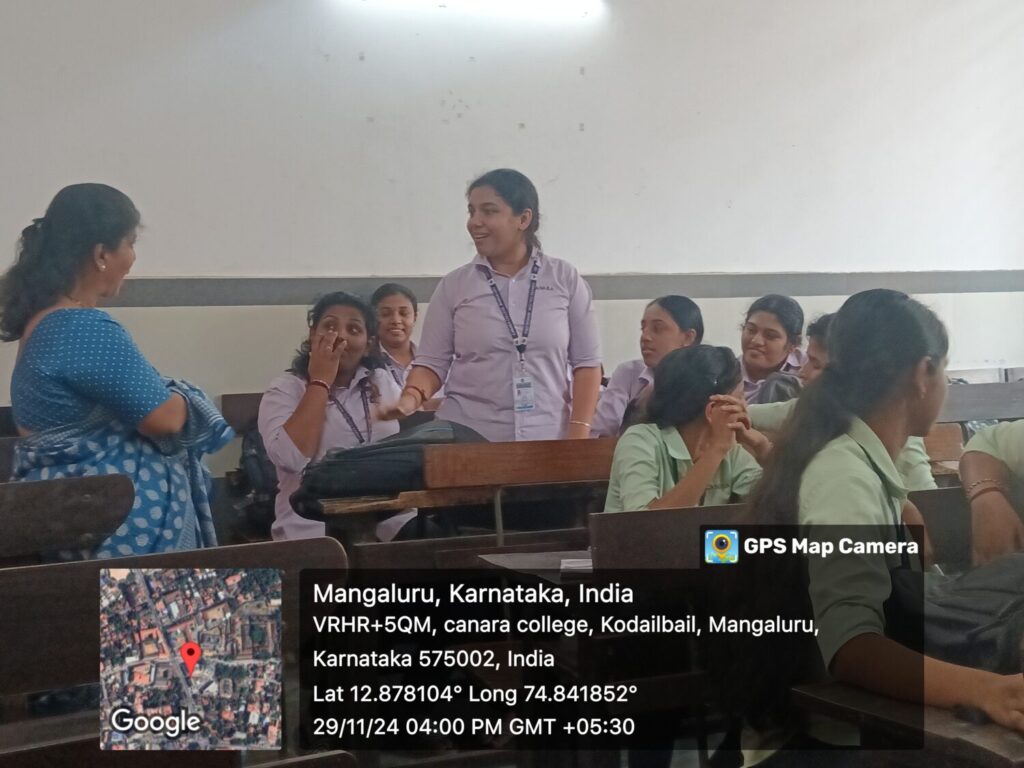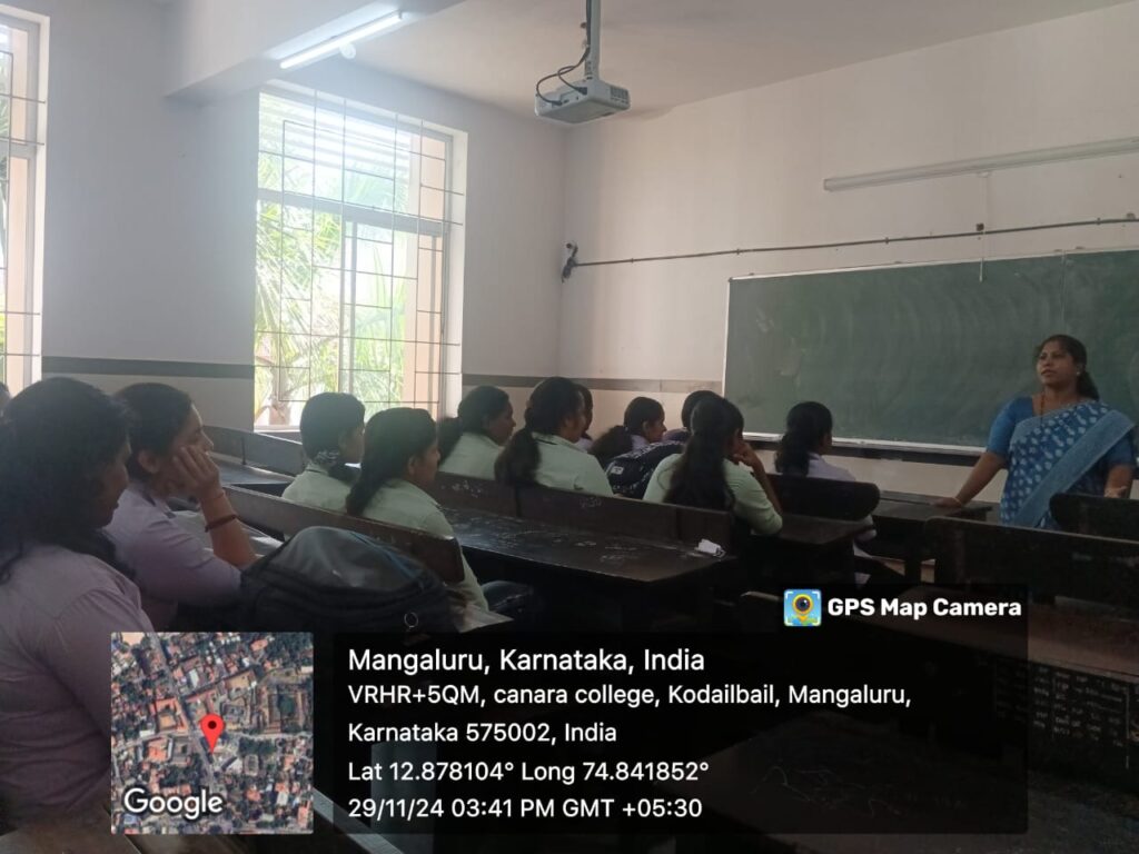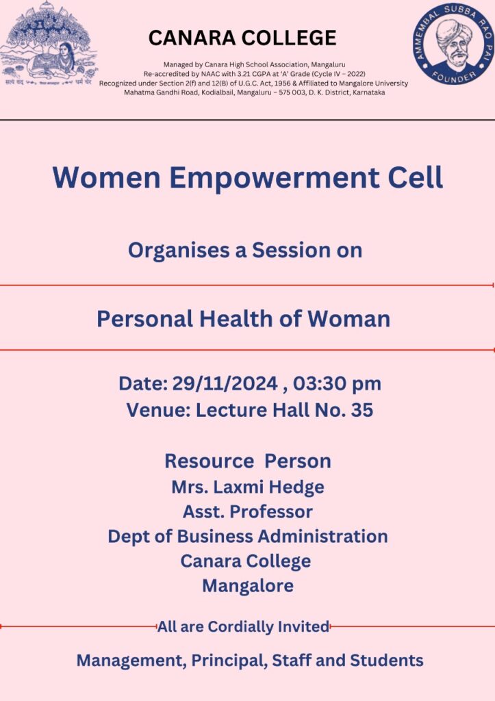 A session on “Personal Health of Women “was organized by the Women Empowerment Cell of Canara College, Mangalore, on November 29, 2024. The resource person was Mrs. Laxmi Hegde, Assistant Professor, Department of Business Administration, Canara College.