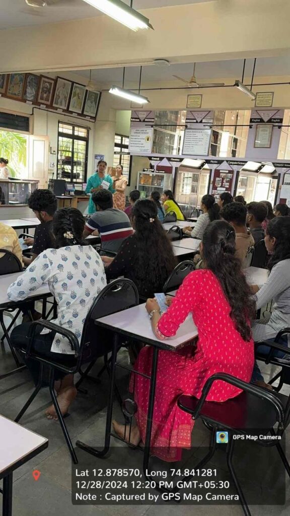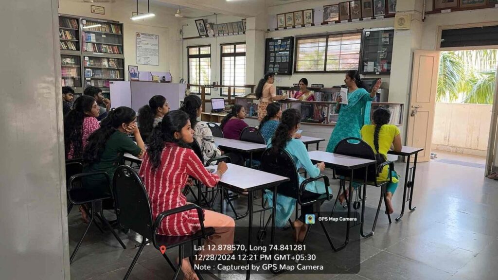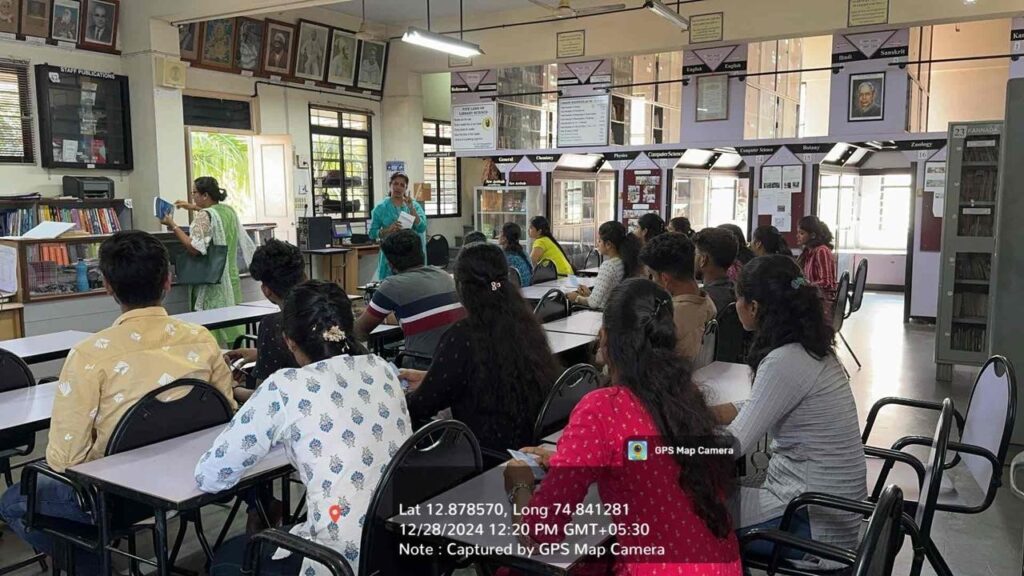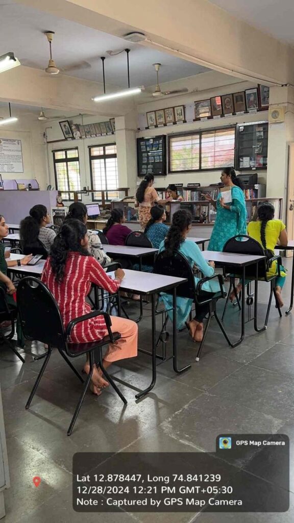 In the Library reading room, December 28, 2024 at 11.30 A.M. to 12.30 P.M., the Library and Information Centre organised the ‘Library Orientation’ programme for freshers of Postgraduate students. In the orientation program for the newly admitted MCA students, the Librarian Mrs. Shruthi briefed the rules, circulation procedures, facilities, services and activities of the Library. She also introduced Library Staff members and functionality of the college library.