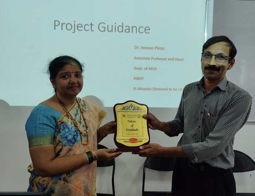 Dr. Jeevan Pinto, Head and Associate Professor, Department of M.C.A., AIMIT, St. Aloysius College (Deemed to be University), Beeri, served as the Resource Person. In his presentation, he provided a categorized overview of various domains and discussed the scope of selecting project topics in key areas such as Artificial Intelligence and Machine Learning, Internet of Things (IoT), Cyber Security, Data Science & Big Data, Web Development, and Cloud Computing. He also shared examples of potential project ideas to help students better understand real-world applications. Furthermore, Dr. Pinto highlighted a variety of tools and resources that can be used to enhance knowledge and skills in developing high-quality, innovative projects.