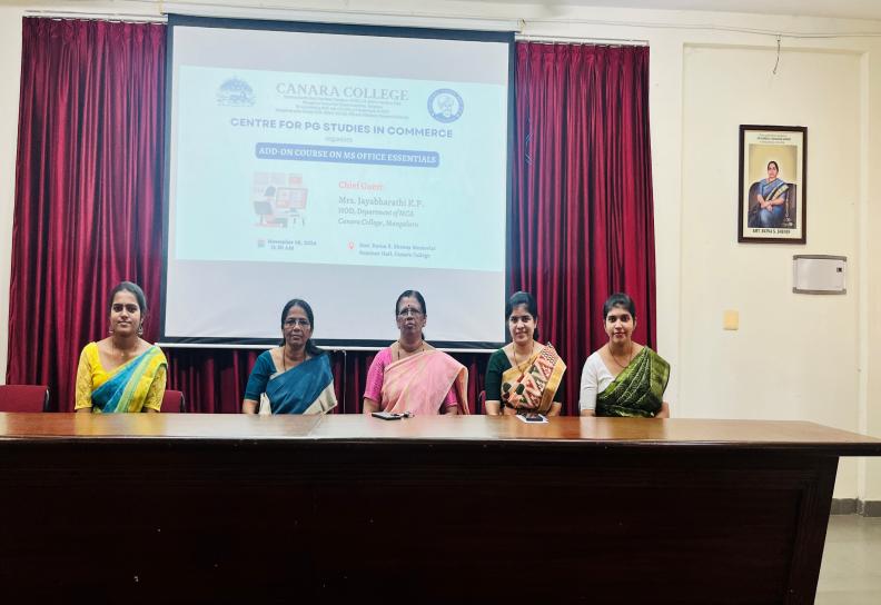 An add-on course MS Office Essentials offered by the Centre for Postgraduate Studies in Commerce to the M.Com students was inaugurated on November 8, 2024. Mrs. Jayabharathi K.P., Head of the Department of MCA inaugurated the programme and wished the students, motivating them as mastery over MS Office tools not only enhances efficiency but also provides a competitive edge in their career. With the rise of digital transformation across industries, these skills are no longer optional but essential. Mrs. Swathi Nayak, PG Coordinator emphasized that data management, financial analysis, and effective presentation skills are crucial in commerce-related careers, and mastering MS Office enhances efficiency, accuracy, and decision-making abilities.