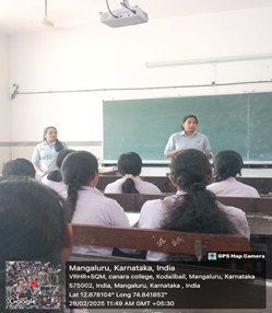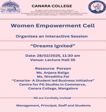 An interactive session on “Dreams Ignited “was organised by the Women Empowerment Cell of Canara College, Mangalore, on February 31, 2025. The resource persons, Ms.Anjana Baliga and Ms.Nivetha Pai of “CANARIZE-A student-led business initiative” Centre for PG Studies in Commerce, Canara College, Mangaluru, discussed that women’s empowerment through entrepreneurship can happen when women have the resources, skills and staff to support and manage business. This can help women gain confidence and economic independence. Their insightful talk ignited the entrepreneurial spirit within our students, motivating them to pursue their dreams. It also promoted a culture of respect and equality for the female gender.