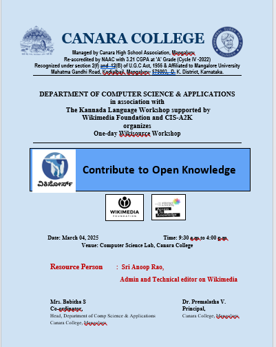 The Department of Computer Science and Applications organized a one-day Wikisource Workshop, “Contribute to Open Knowledge,” in association with The Kannada Language Project, supported by the Wikimedia Foundation and CIS-A2K, Bengaluru, on March 4, 2025, at the Computer Laboratory, Canara College.