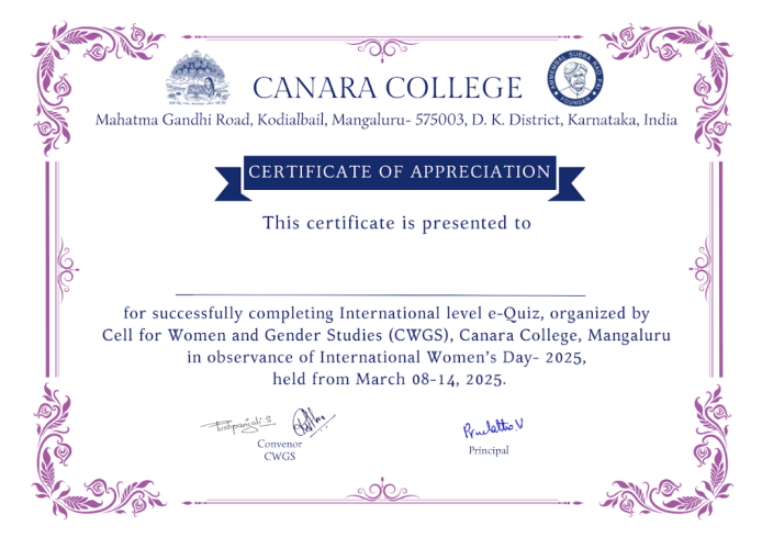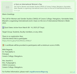 An international-level e-Quiz on International Women’s Day- 2025 was organized by the Cell for Women and Gender Studies from March 8, 2025, to March 15, 2025, to commemorate International Women’s Day.
