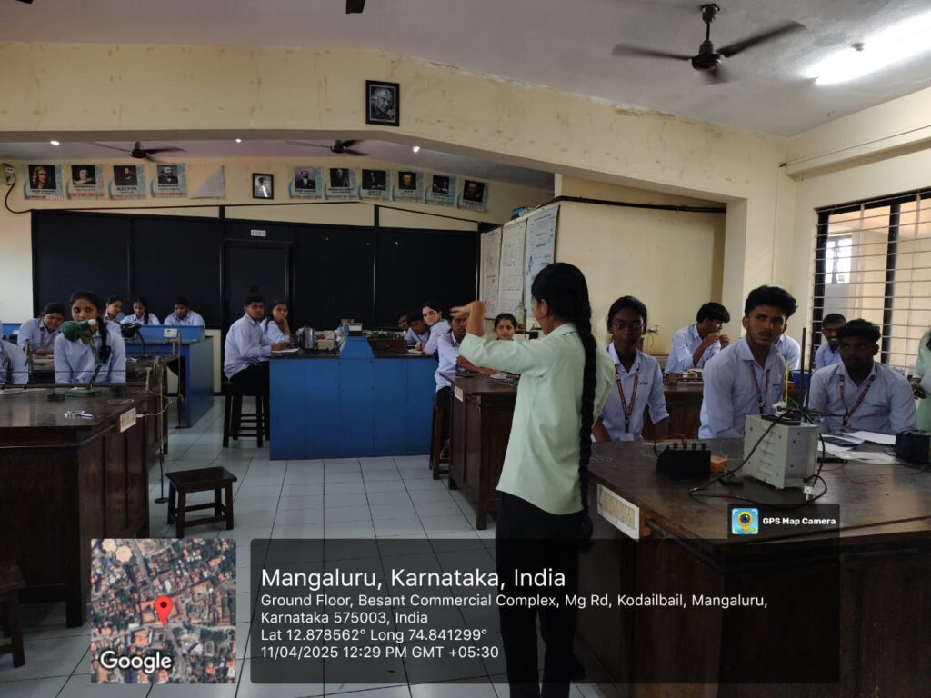 On April 11, 2025, the Department of Physics organized a quiz competition in the Physics Laboratory for the First B.Sc. students. The final-year B.Sc. students, Ms. Prathiksha Kotiyan and Ms. Anusha Shenoy, gave instructions about the rules and regulations of the competition. The quiz consisted of two rounds: a written test and a “Guess the Scientist” round. The competition started at 11:45 a.m. Eight teams participated in the competition, each comprising two students. A total of 31 students participated.