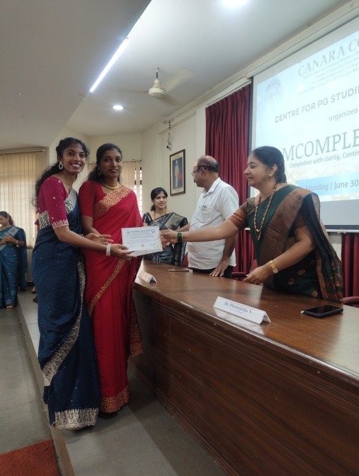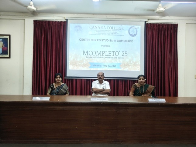 The Centre for Post Graduate Studies in Commerce organized a special programme titled “MCOMPLETO’25” on June 30, 2025, to mark the completion of the academic year 2024–25 for the outgoing M.Com Students. The event began at 10:00 A.M. with Ms. Srilaxmi of I M.Com as the Master of Ceremony. Ms. Raksha delivered the welcome speech, and Ms. Ankitha C proposed the vote of thanks. The Chief Guest for the event was Sri CA M Jagannath Kamath, Correspondent of Canara College, who appreciated the students and said that the outgoing M.Com Students are the brand ambassadors of the department. He wished them all a bright and successful future.