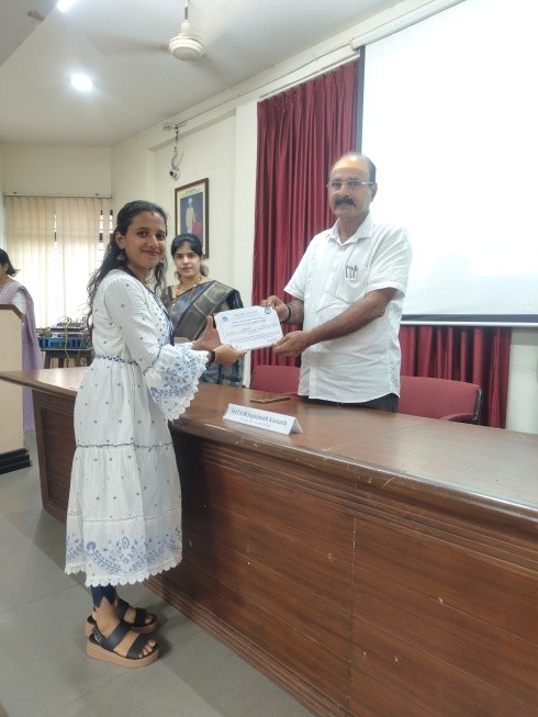 A total of 69 students attended the programme. Letters of appreciation were given to students who served as student faculties and resource persons during the academic year 2024–25. Prizes for various competitions were also distributed by the Correspondent and the Principal, Dr. Premalatha V. The prize distribution ceremony was hosted by Ms. Sneha Pai and Ms. Shwetha Pai, faculty members of the M.Com Department. The event was coordinated by Mrs. Swathi Nayak, PG Coordinator. After the formal programme, a farewell function was organized by the First Year M.Com Students to bid a warm goodbye to their seniors.