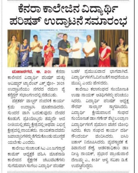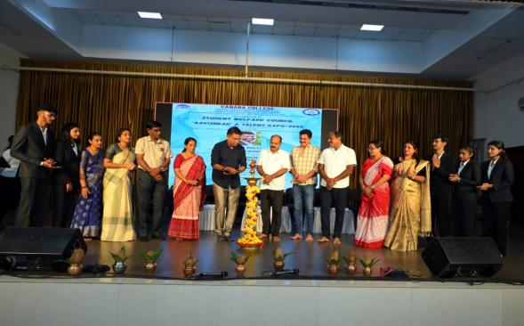 The Student Welfare Council and The Fine Arts Association of Canara College organised Inauguration of Student Welfare Council and ‘Aavishkar’ A Talent Expo-2025 on August 18, 2025. Shri Walter Nandalike, Founder and Managing Director of Daiji World Private Ltd., inaugurated the event and delivered a speech. He said that living beautifully is a gift from God. Everyone has their own unique strengths and weaknesses; comparing oneself to others is not right, and blaming or looking down on others is even worse than cancer. Leaders should take responsibility and move forward. In today’s competitive world, no one is perfect; having a determination to do better than others is important. He also said that Canara has produced world class leaders
