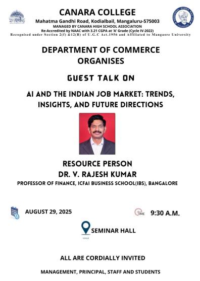 The Department of Commerce of Canara College has organized a guest talk on ‘AI and the Indian Job Market: Trends, Insights, and Future Directions’ by Dr. V. Rajesh Kumar, Professor of Finance at ICFAI Business School, Bangalore, on August 29, 2025. The resource person shared his views on the ways in which AI is reshaping industries and job roles in India. He also shared information on the need for professionals to be adaptable and continuously learn new skills to remain competitive in the job market.