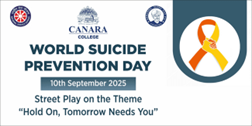 On account of World Suicide Prevention Day (September 10, 2025), NSS volunteers of Canara College performed a Street Play at City Centre Mall, Mangaluru, on the theme “Hold On, Tomorrow Needs You.” The play highlighted real-life situations leading to stress, depression, and suicidal thoughts, while emphasizing the importance of seeking timely help, offering emotional support, and spreading positivity.