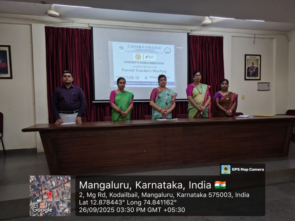 The Parent-Teacher Meet of the Second and Final-year BBA students was organized on September 26, 2025, at 3:30 PM at Seminar Hall, Canara College. Mrs. Seema Prabhu S., Head of the Department, provided insights into crucial aspects like examination procedures, the importance of regular attendance, and other related activities. Mrs. Laxmi Hegde, Academic Mentor of the Final BBA, extended a warm welcome to both the dignitaries and the assembled gathering. Mr. Hardik P. Chauhan, Academic Mentor of II BBA, proposed the Vote of Thanks.