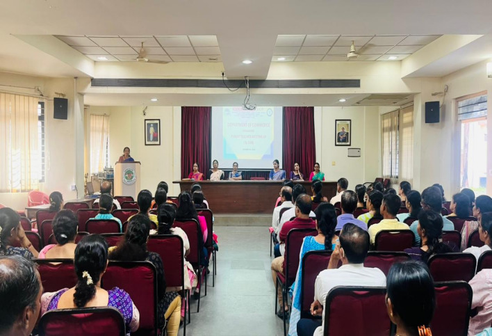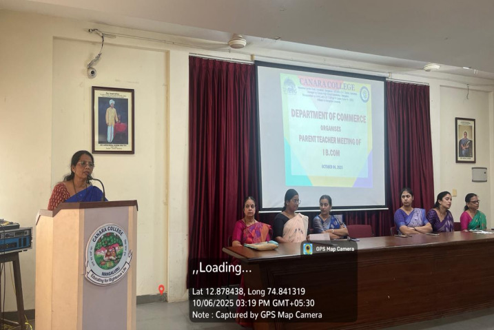 A Parent-teachers meeting was organized for the First-year B. Com on October 06, 2025, at 3.30 p.m. in Smt. Ratna S. Shenoy Memorial Seminar Hall. The meeting began with a welcome address by Mrs. Dejamma A. Head, Department of Commerce and was followed by an introduction of the faculty members. Mrs. Dejamma A. Head, Department of Commerce, highlighted the importance of being regular to the class and being punctual, college guidelines, and uniform. She also specified the importance of taking part in extracurricular activities. Parents were given the opportunity to share their observations, concerns, and suggestions regarding the college’s academic and administrative processes.