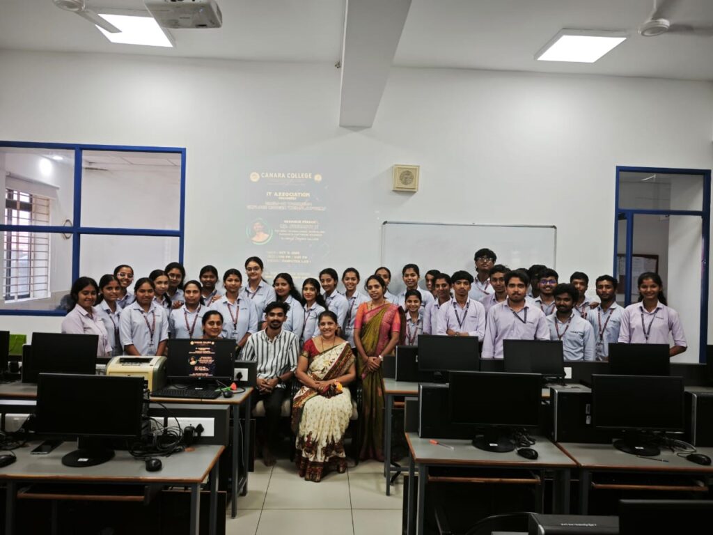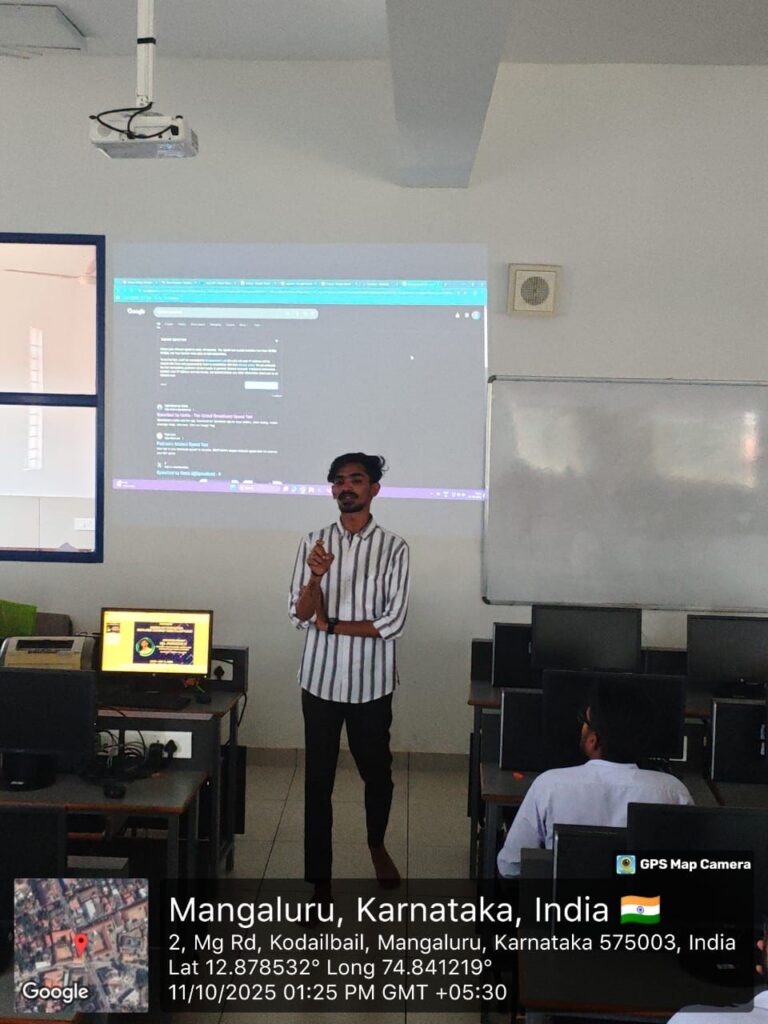 The IT Association organized a hands-on workshop titled “Explore Modern Web Platforms” on October 11, 2025, from 1:00 PM to 3:00 PM in Computer Lab 1. The session was conducted by Mr. Sushanth K, Associate Software Engineer at Tetherfi Technologies, Mangaluru, and an alumnus of Canara College.