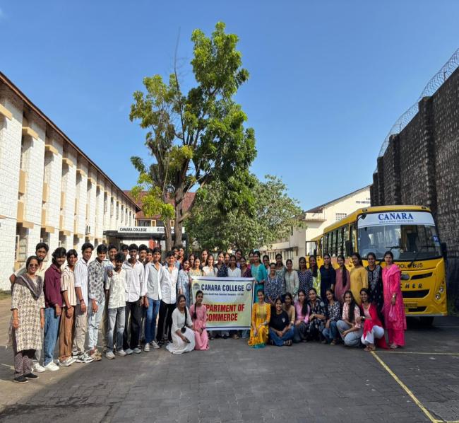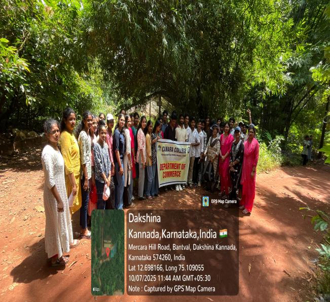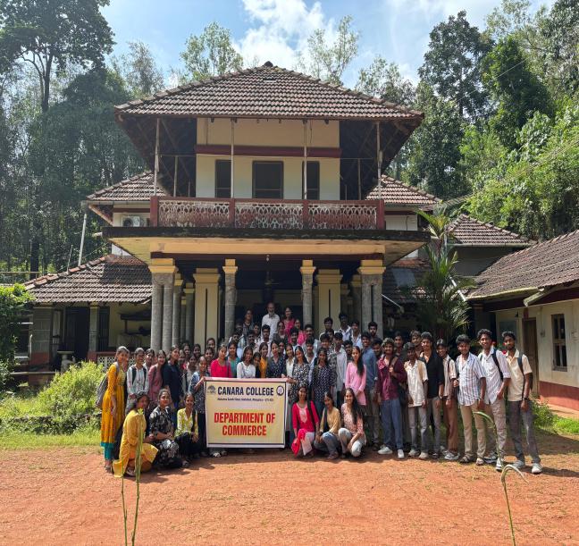 The I B.Com A class of Canara College visited Varanashi Organic Farms, Adyanadka, on October 7, 2025. The journey began at 8:30 a.m. from the Canara College campus. Upon arrival, the students and faculty members were warmly welcomed by Dr. Varanashi Krishnamoorthi, the owner of the farm. He gave an insightful presentation about the farm’s sustainable initiatives and its efforts to promote organic agriculture.