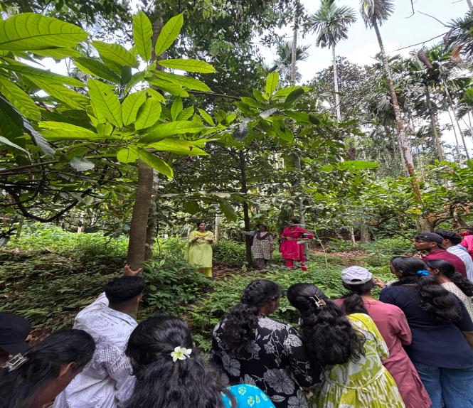 Students explored various sections of the farm and learned about commercial crops such as Cocoa, Areca nut, Pepper, Jackfruit, and Coconut trees. They also witnessed the functioning of biogas plants, compost units, sprinkler systems, and water management techniques, which provided practical knowledge of modern eco-friendly farming methods.