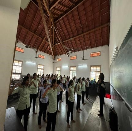Ms Sanidhya S. Shetty and Ms. S. Pooja introduced a dynamic blend of classical dance elements with modern rhythms. The session covered rhythmic coordination, expressive gestures (mudras), and creative choreography that synchronised with the devotional songs practised earlier. 58 Students actively participated in this session. The training session successfully met its objectives of nurturing artistic talent and promoting cultural engagement. By integrating devotional song with dance fusion, the program offered a fresh, holistic approach to artistic expression, leaving participants inspired and eager for further creative exploration. The event was coordinated by Mrs. Usha Nayak, Convener of the Fine Arts Association, with assistance from members of the association.
