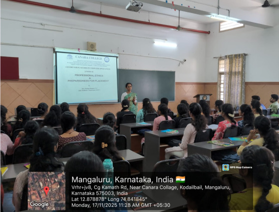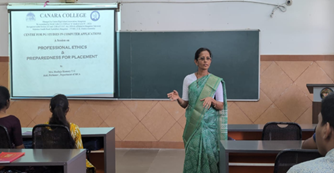 The Centre for PG Studies in Computer Applications, Canara College, organized an insightful session on “Professional Ethics and Preparedness for Placement” on November 17, 2025, for the First Year MCA students (2025–26 batch) as part of the Induction Programme. The primary goal of the session was to enhance students’ awareness of ethical conduct in professional environments and to equip them with essential employability and career-readiness skills.