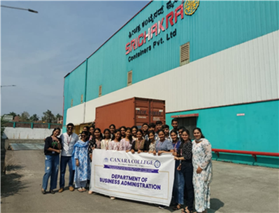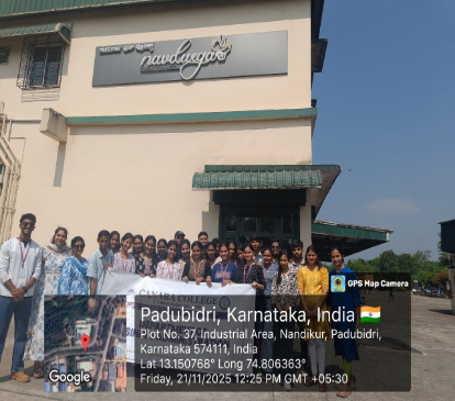 An industrial visit was organised for the second-year BBA students by the Department of Business Administration on November 21, 2025, to Srichakra Plastic Containers Pvt. Ltd. and Navadurga Food Products Pvt. Ltd., located in the Nandikur Industrial Area, Padubidri. A total of 24 students were accompanied by their Academic Class Mentors, Mrs Rithika and Ms Bhavana. At Srichakra, students observed the end-to-end production of sack thread and sacks, including raw material handling, thread conversion, roll formation, stitching, machine capacity management, and shipping logistics. They also learned about additional products, such as calcium seals used for LPG cylinders.