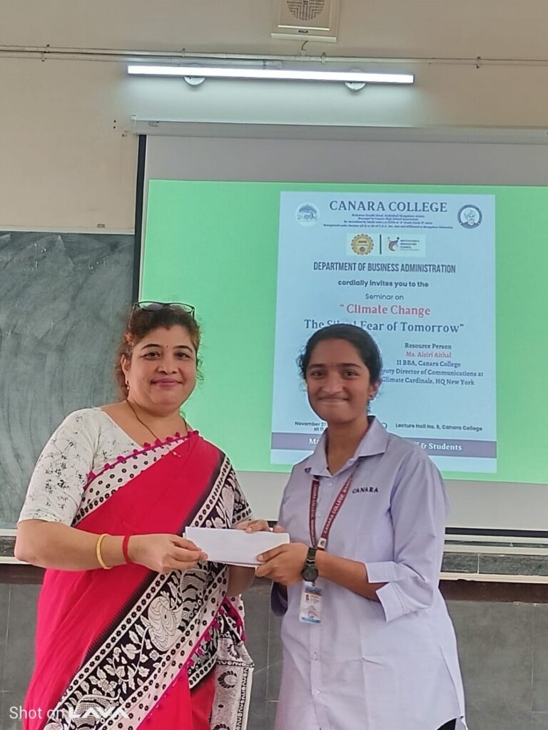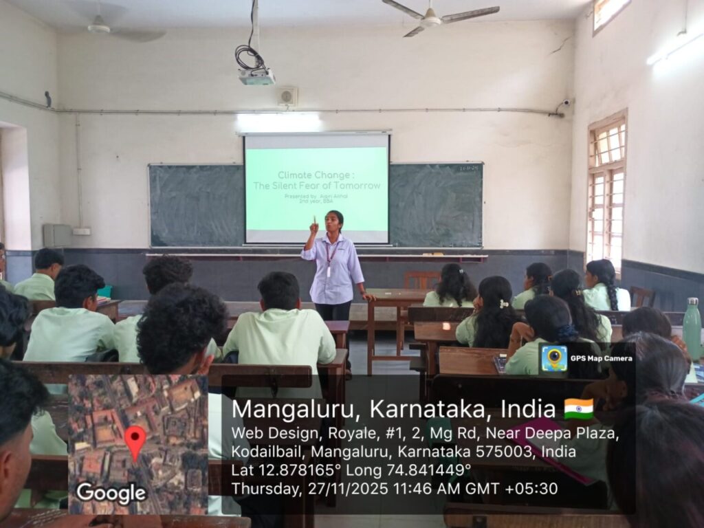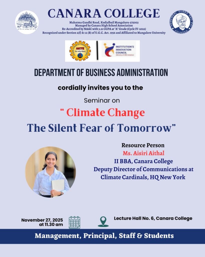 The Department of Business Administration, in collaboration with the Institution’s Innovation Council (IIC) of Canara College, Mangaluru, organized an informative and thought-provoking seminar on climate change on November 27, 2025. The session aimed at creating awareness among students about global environmental issues and motivating them to contribute actively towards fostering a sustainable future.