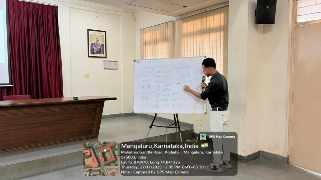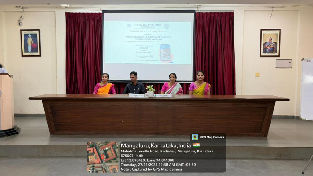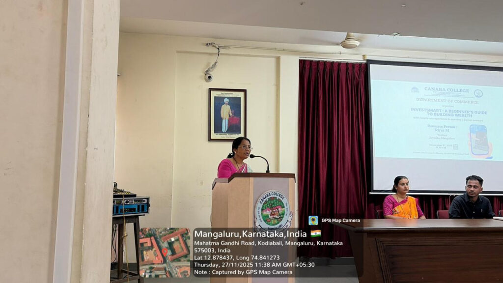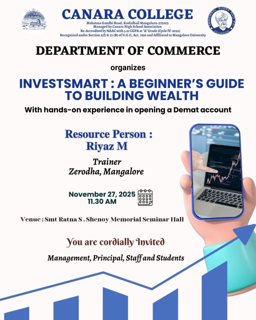 The Department of Commerce organized a training session titled “InvestSmart: A Beginner’s Guide to Building Wealth” on November 27, 2025, at 11:30 AM in the Smt. Ratna S. Shenoy Memorial Seminar Hall. Mrs. Dejamma A., Principal In-Charge, presided over the function and addressed the gathering. She emphasized the need to develop investment habits among youth to build financial security and independence. The resource person for the programme was Mr. Riyaz M, Trainer from Zerodha, Mangalore.