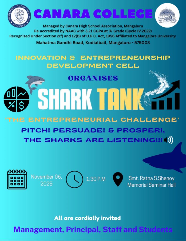 The Innovation & Entrepreneurship Development Cell of Canara College organized “Shark Tank – The Entrepreneurial Challenge” on November 06, 2025, at 1:30 P.M. in the Smt. Ratna S. Shenoy Memorial Seminar Hall. The programme aimed to inculcate entrepreneurial thinking, innovation, and business acumen among students.