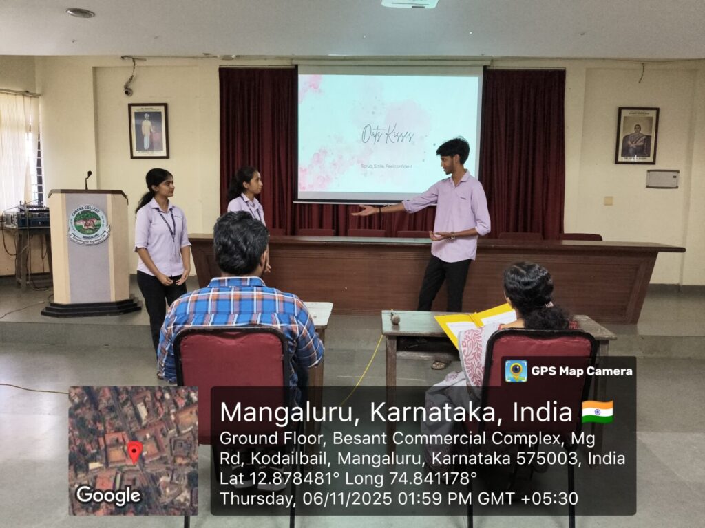 At the conclusion of the event, the results were announced. The First Place was secured by “Dive Dynamos” comprising Arpitha, Chayarashmi, and Manjunath of II M.Com. The Second Place was awarded to “Aqua Visionaries” consisting of Arjun, Soyam, and Veer of II B.Com C. The Third Place was bagged by “Bold Bidders” comprising Nowreen Banu, Harshita, and Gauthami Shetty of II M.Com.The programme provided an engaging platform for students to showcase their creativity and confidence, and it successfully motivated participants to consider entrepreneurship as a viable career option.