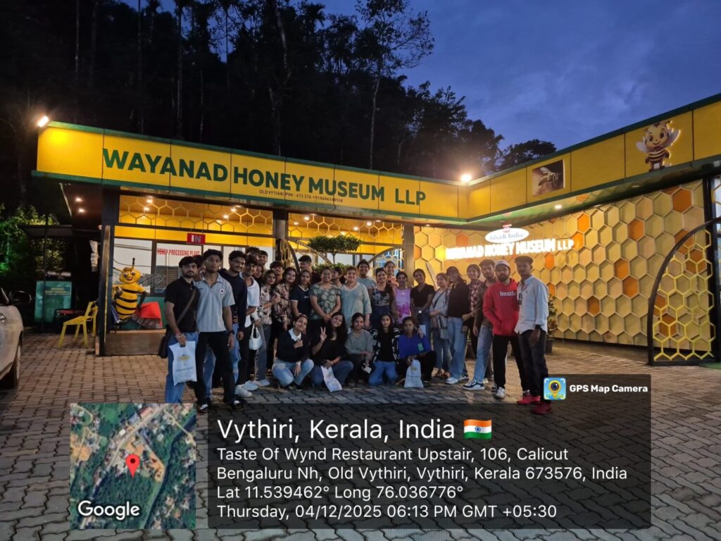 At the Chocolate Factory, students observed the complete chocolate manufacturing process, including raw material selection, processing, quality control, packaging, and branding, gaining insights into hygiene standards and market-oriented production. During the visit to the Tea Factory, students were introduced to various stages of tea processing such as withering, rolling, fermentation, drying, grading, and packing. The importance of quality assurance, climatic conditions, and supply chain management in the tea industry was explained. At the Honey Museum, Wayanad, students learned about beekeeping practices, honey extraction techniques, and value-added honey products. The museum highlighted sustainable harvesting methods, biodiversity conservation, and rural entrepreneurship.